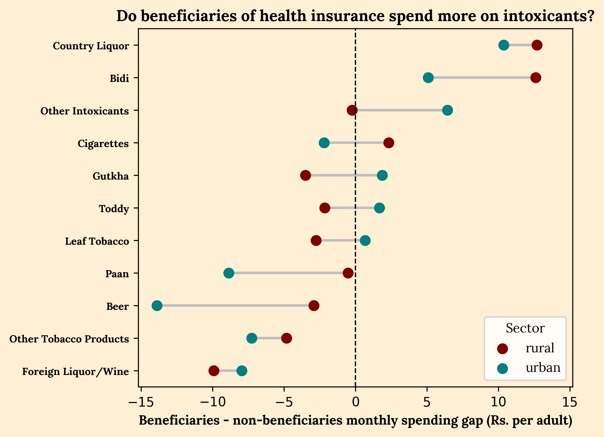 There’s barely any interaction. The difference between the consumption of intoxicants by beneficiaries of public healthcare, and that of non-beneficiaries, is negligible. For gutkha in particular, the urban beneficiary spends an average of 2 rupees per month more than the urban non-beneficiary, whereas the rural beneficiary spends 4 rupees less than the rural non-beneficiary. The entire chart spans only a difference of +/- Rs 15.