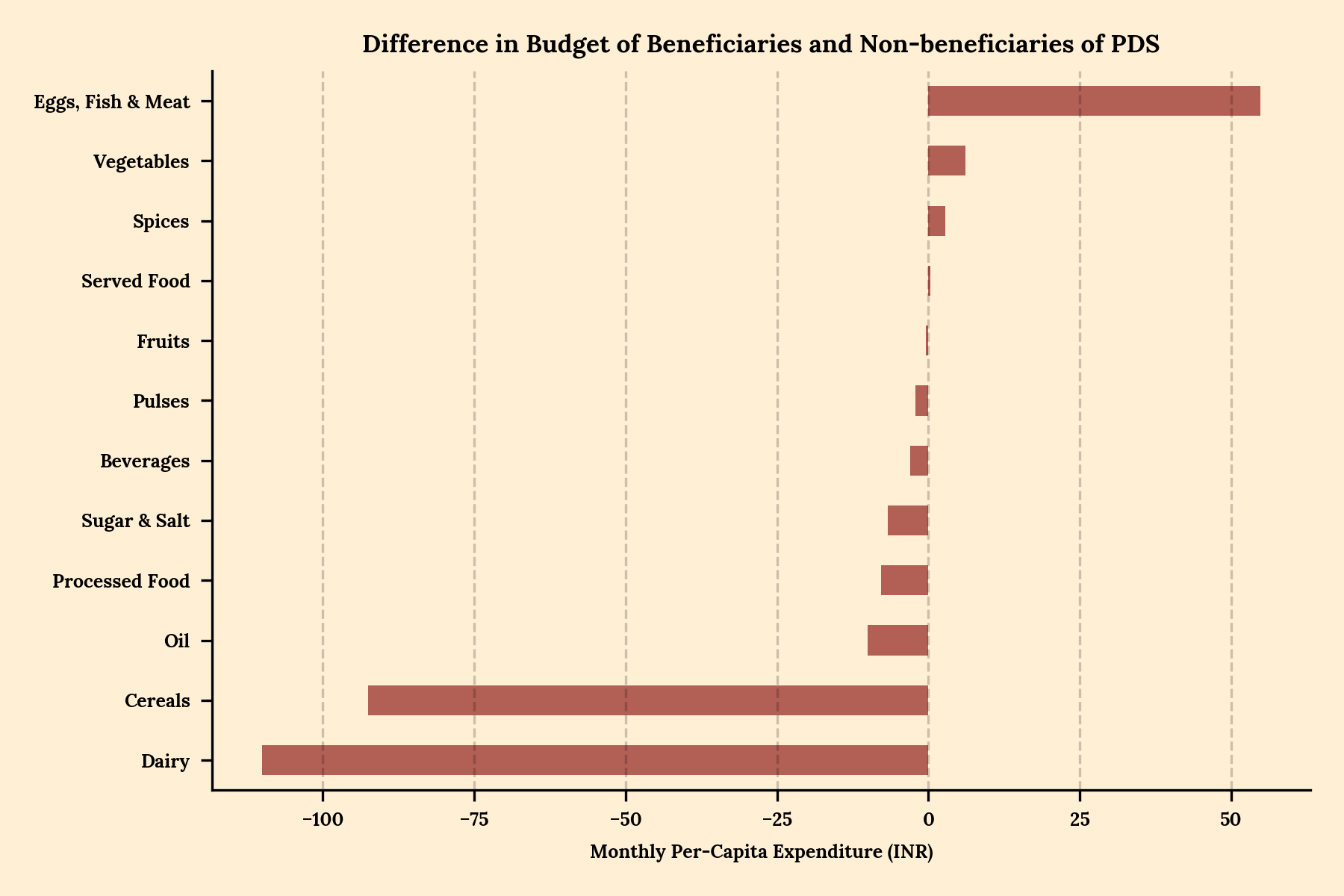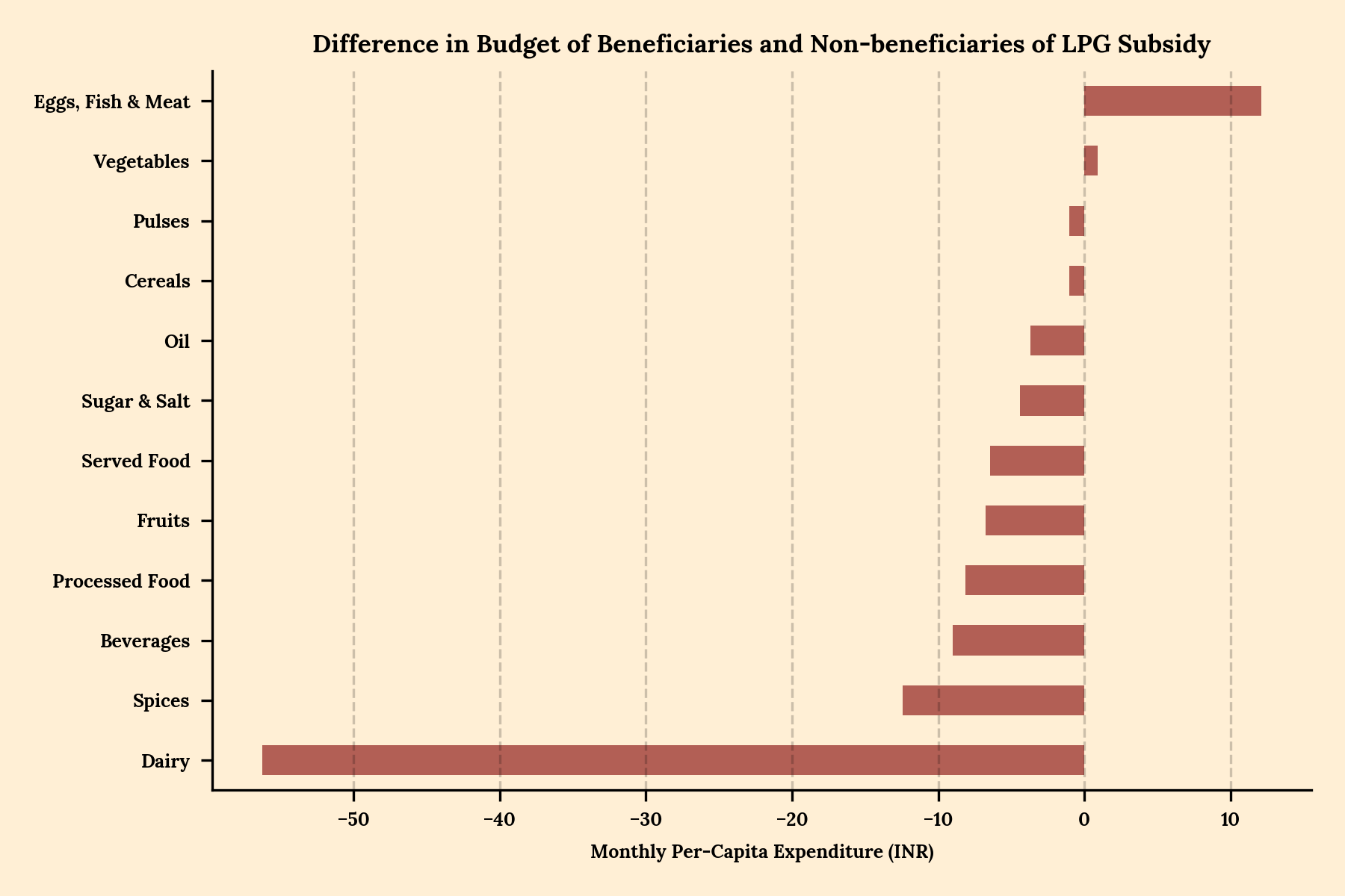 The average PDS beneficiary consumes nearly Rs 100 worth of dairy less than their counterpart, and also less cereals. But they also eat Rs 50 worth more of eggs, fish and meat. This pattern of less dairy and a little more meat repeats in LPG subsidies as well as public healthcare. Moreover, the positive spend on meat survives even when we break it down by religion and caste. It’s not like a subset of beneficiary households are eating more meat and pushing the average up. Among every caste and religion (with the exception of Sikhism), recipients of aid eat more meat than non-recipients.