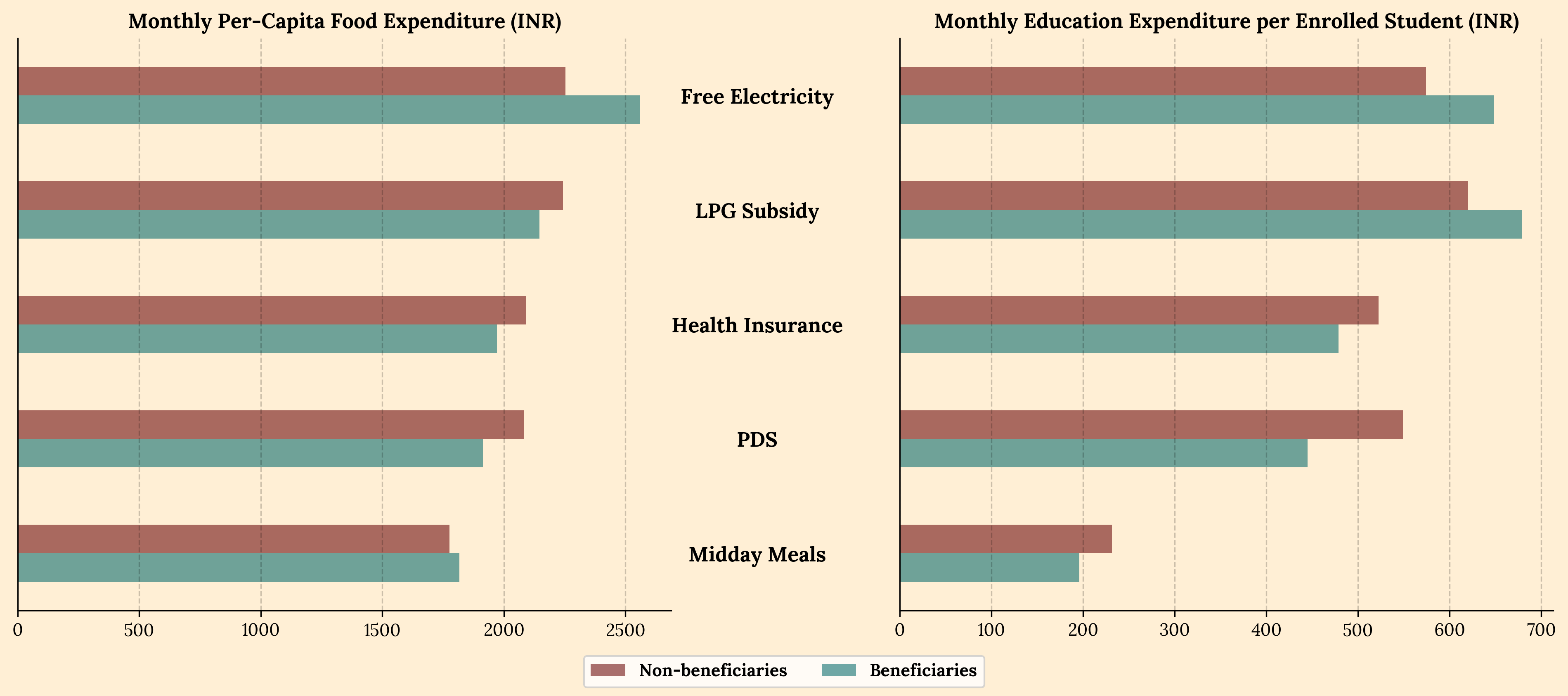 Broadly, for each type of aid, we first find how the food budget of a beneficiary household differs from that of a non-beneficiary household. Then we do the same for education. If we were to look at nationwide averages, the results are unsurprising, if a little disappointing.